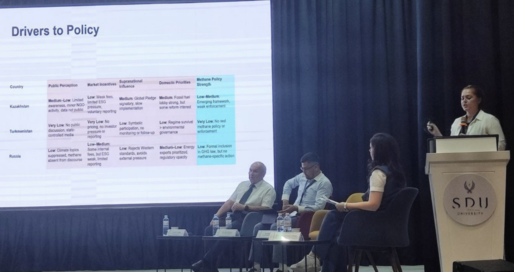 Using a comparative case framework, including Kazakhstan, Russia, and Turkmenistan, the presentation explored why methane regulation often lags despite its cost-effective mitigation potential. Highlighting four drivers of policy action (public perception, market incentives, supranational influence, and domestic priorities), the study offered insights into why some states act while others remain idle, even when there are environmental and economic benefits.